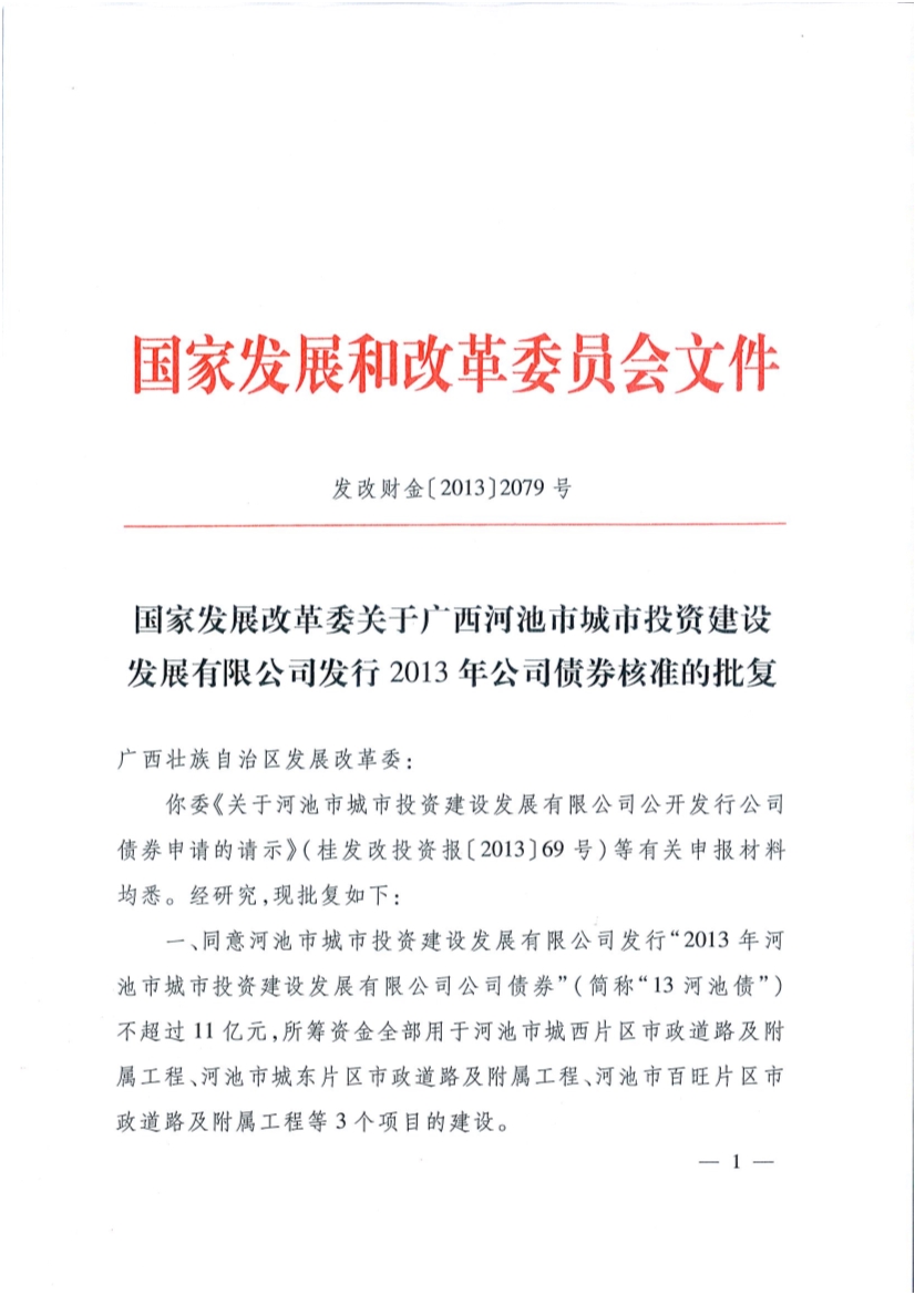 國家發改委批復同意河池市城投公司發行一期債券
